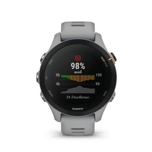 Display Size 1.1 inchnWireless Bluetooth, ANT+nRechargeable battery YesnCharge time Smartwatch mode: Up to 12 days, GPS-only GNSS mode: Up to 26 hoursnSensors Components YesnWater Resistance Yes, 5 ATMnMemory 4 GBnColor Power Greynsize 27.5 mm.nMaterial Fiber-reinforced polymer, SiliconenCompatibility iPhone, AndroidnNotification YesnDimensions W x D x H 4.1 x 4.1 x 1.24 cm.nWeight 0.039 Kg.nWarranty 1 Year, Accessories 1 YearnOption N/AnIn the Box Forerunner 255S, Charge/data cable, Documentation