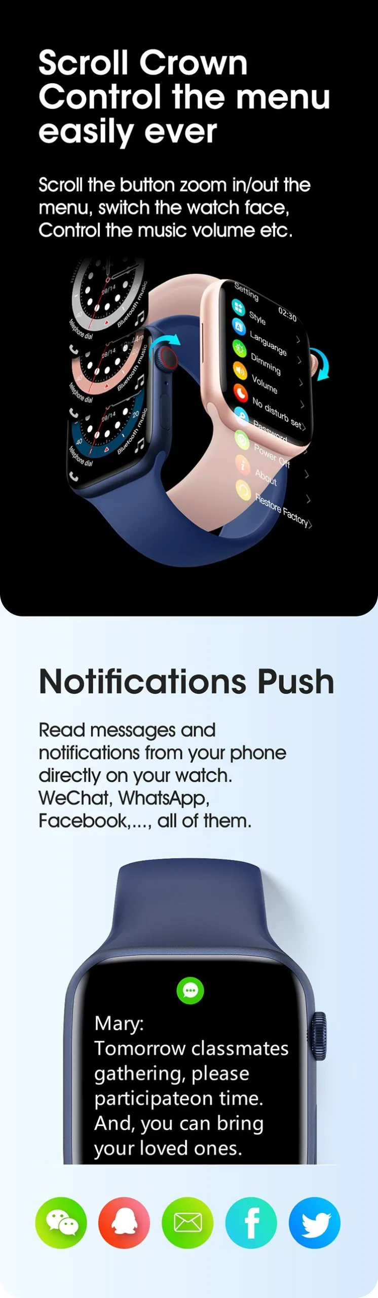 - แจ้งเตือนข้อความ Line, Facebook, Calls, Email, SMS และอื่นๆ โดยสามารถตั้งแค่แจ้งเตือนได้ผ่าน